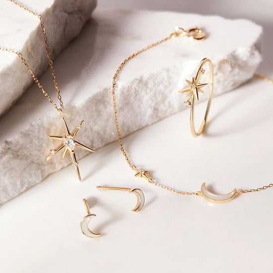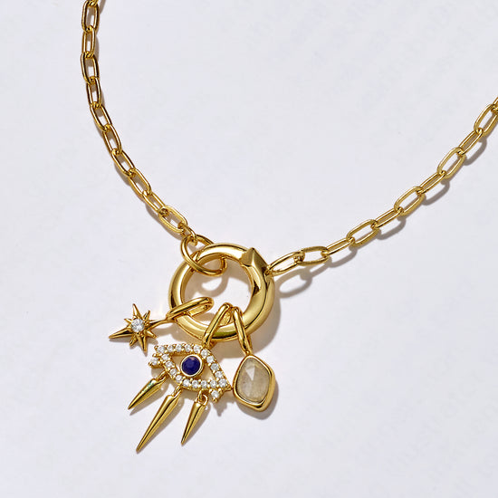 Gold Sparkle Chain Charm Connector Necklace, £205 | Gold Sparkle Charm, £15 | Gold Pavé Star Sphere Charm, £45 | Gold Shimmer Chain Charm Connector Necklace, £109 | Gold Supernova Charm, £109
